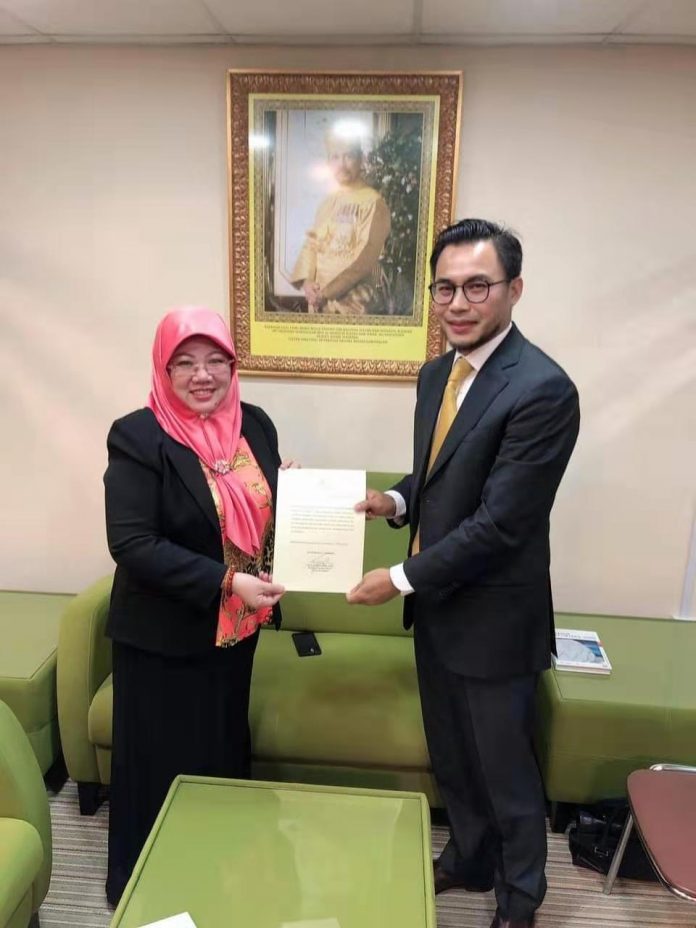 在上周六,在汶莱外交部属下礼宾和领事事务单位副主任苏卡迪,瑞典礼宾和领事事务官员哈嘉艾菲莎的见证下,汶莱外交部属下礼宾和领事事务单位代主任哈吉莫哈末法克利移交汶莱第二外交部长拿督伊万签名的许可领事证书予诺茱蒂。