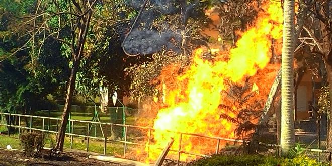 砂拉越北砂 煤气管破裂自燃 10尺火柱吓坏路人 2015年7月2日 煤气输送管破裂且着火自燃,火焰高约10尺,火势吓人。 (本报美里01日讯)煤气输送管破裂且着火自燃,冒起高约10尺的巨大火焰,火势吓人。Advertisement 这起煤气自燃事件今午3时许,在机场路陆路交通局附近发生。 据悉,该天然煤气输送管破裂,发出震耳欲聋的巨响,怀疑因天气炎热关系而引发着火自燃现象,火焰高约10尺,热力逼人,形如火柱的情景吓坏路过民众。 美里消防与救拯局派出消防员赶抵灭火,因煤气外泄量过大,多次试尝仍无法将火柱灌灭,直到天然煤气单位技术人员赶抵,将附近煤气管输送阀关上,始成功灭火。