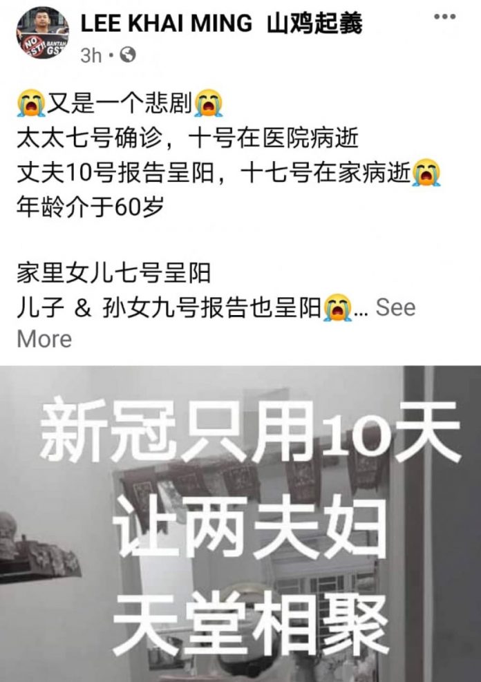 (吉隆坡18日讯)病毒无情!60余岁的华裔男子在感染新冠肺炎的妻子病逝当天不幸确诊,随后更因丧妻之痛,加剧了病情恶化,最终于睡梦中离世,导致儿女们在短短一周内痛失两名至亲。