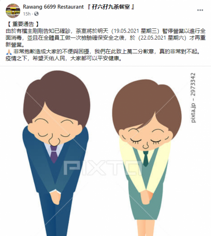 有关贴文表示,茶室全体员工都已接受了冠病检测,确保安全后,才会本月22日(周六)重新开业。