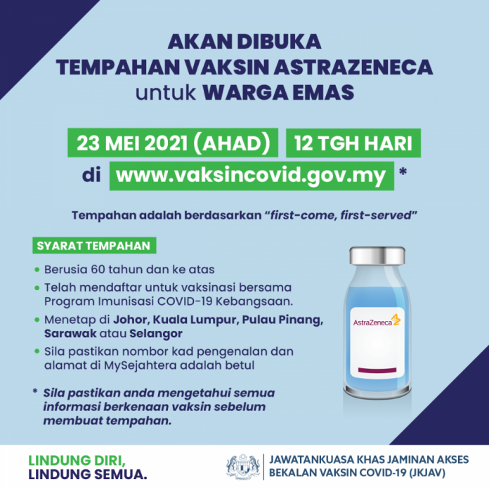 阿斯利康疫苗第二阶段的接种计划,仅开放予吉隆坡、雪兰莪、槟城、柔佛和砂拉越,5个州属或城市,年满60岁或以上的乐龄人士登记。