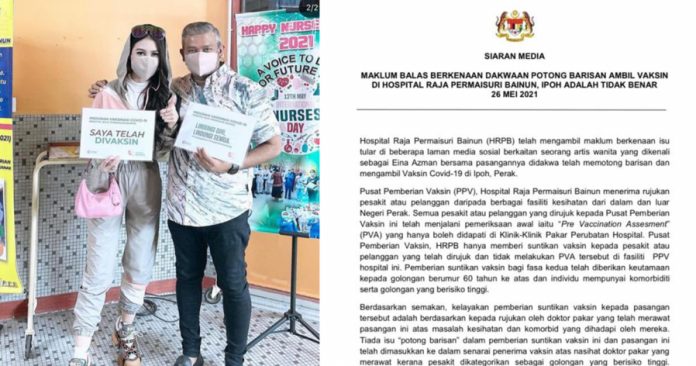 (怡保27日讯)巫裔女艺人艾娜阿兹曼夫妇日前被网民炮轰跨州前往怡保苏丹后端姑拜浓医院插队接种疫苗风波,院方澄清,该对夫妇是依据治疗他们健康问题和合并症(comorbid)的专科医生建议而在医院接种疫苗。