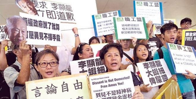 香港媒体报导,香港社民连、职工盟等多个劳工团体,以及国际特赦组织香港分会,近百人到新加坡驻港总领事馆所在的海富中心楼下抗议,要求新加坡政府释放早前因辱骂李光耀而被捕的16岁少年余澎杉。