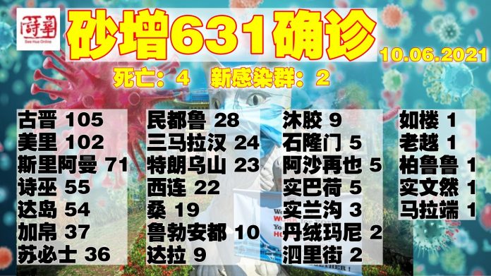 新增确诊病例来自古晋105宗、美里102宗、斯里阿曼71宗、诗巫55宗、达岛54宗、加帛37宗、苏必士36宗、民都鲁28宗、三马拉汉24宗、特浪乌山23宗、西连22宗、桑19宗、鲁勃安都10宗、达叻9宗、沐胶9宗、石隆门5宗、阿沙再也5宗、实巴荷5宗、实兰沟3宗、丹绒马尼2宗、泗里街2宗、如楼1宗、老越1宗、柏鲁鲁1宗、实文然1宗及马拉端1宗。全砂共累积5万3613宗。