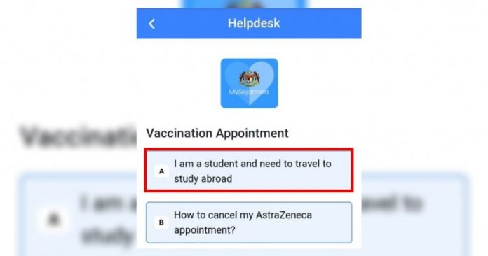 (吉隆坡30日讯)MySejahtera手机应用程式的帮助平台(Helpdesk)新增一功能,帮助出国升学的学子,在出国前完成新冠疫苗接种。