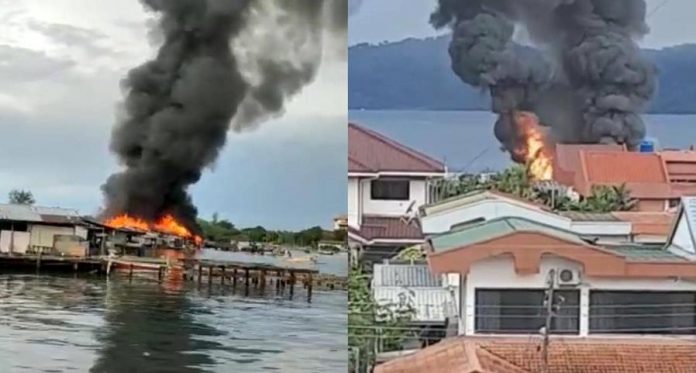 亚庇6日讯|今早7时15分左右,位于丹容亚路,甘榜巴鲁水上屋发生大火。