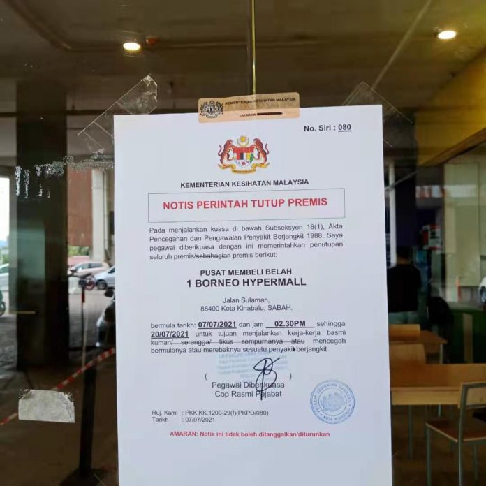 沙巴 1Borneo霸级商场 今日起关闭14天 2021年7月7日 (亚庇7 日讯)本州著名1Borneo霸级商场因出现新冠感染群,被卫生局谕令由7 月7日至7 月20日关闭以进行消毒,为期14天。Advertisement 沙巴冠病事务发言部长马西迪昨日表示,该商场内的Bataras超市出现一个感染群,累计26人确诊。