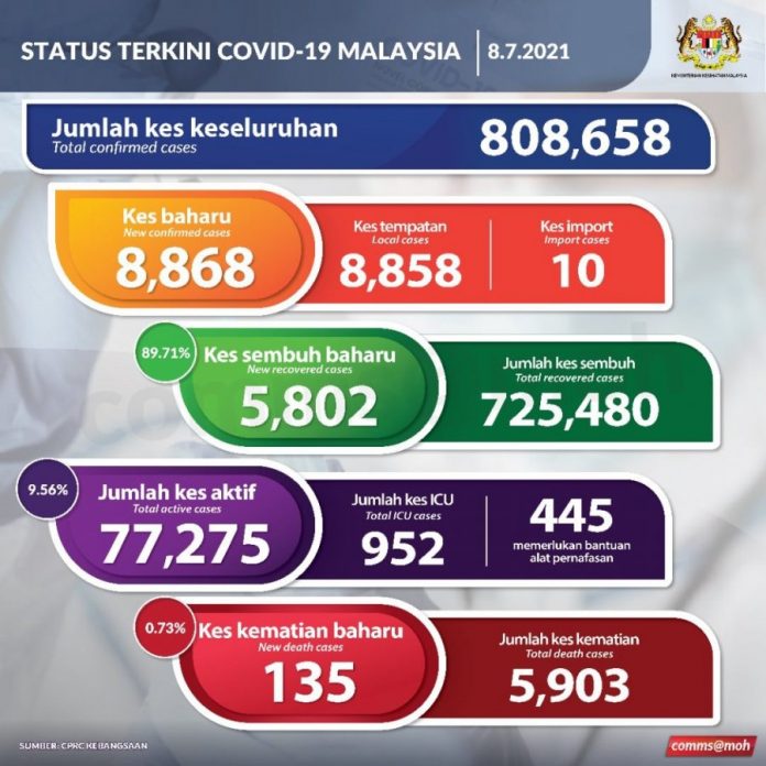 (吉隆坡8日讯)截至今日中午12时,我国新增确诊病例计有8868宗病例,累计确诊达80万8658宗。