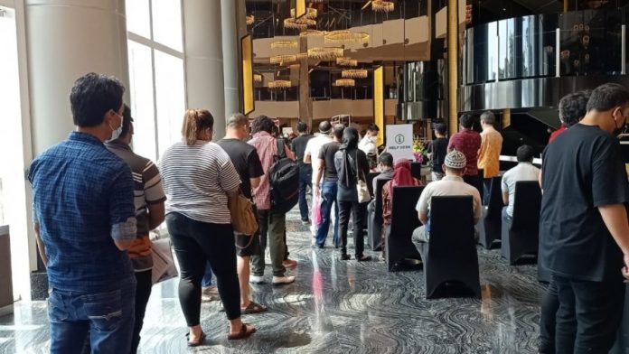 他透露,在服务柜台处,有许多外劳资料错误而造成进度拖慢。直到中午开始,疫苗中心外开始出现人潮排队,曝晒在阳光底下。