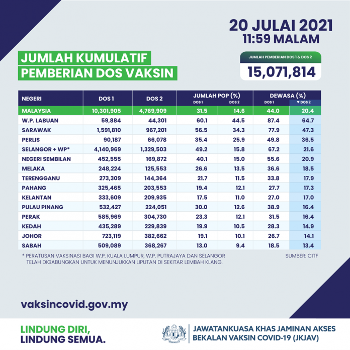 完成接种2剂疫苗人数最多的是纳闽,达44.5%(4万4301人),或成人人口64.7%。其次则是砂拉越34.3%(96万7210人),或成人人口47.3%。