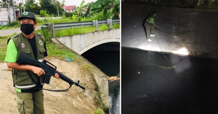 (山打根16日讯)近日被发现在山打根北路7哩发佳新村附近大水沟出没的鳄鱼,已在周日晚被山打根野生物局官员开枪射杀。