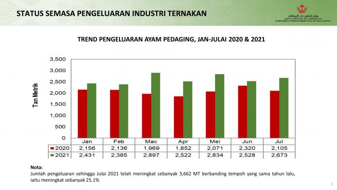 截至2021年7月,肉鸡行业总产量为1万8270公吨,而2020年同期为1万4608公吨,增长了25%。