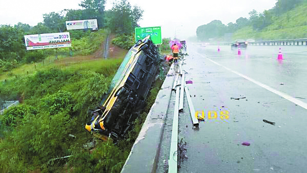 (万挠19日讯)长途巴士暴雨中失控猛撞大道旁围栏后翻覆深谷,车上7名乘客包括司机顺利脱困,分別蒙受轻重伤。
