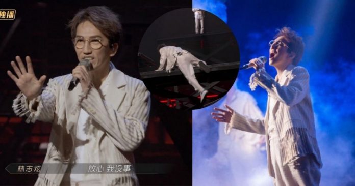 林志炫在最新一集《披荆斩棘的哥哥》中与胡海泉、热狗、刘迦献唱了歌曲《飞云之下》。演唱完后,林志炫先向观众鞠躬致意,一边拍手一边后退时,却不慎跌落舞台,他马上回应:“没事”,随后再一层一层爬上舞台,回到原来的位置,继续同观众道歉,令人敬佩。