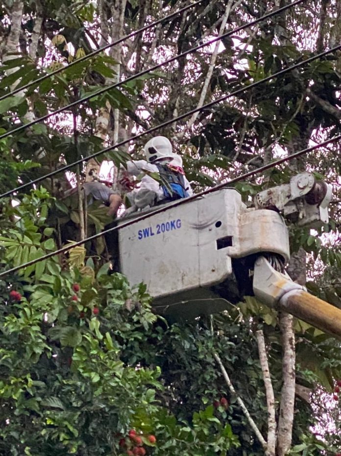 消防队赶到现场,当时下着小雨,树木湿滑,又靠近电缆,使消防队救助工作困难。