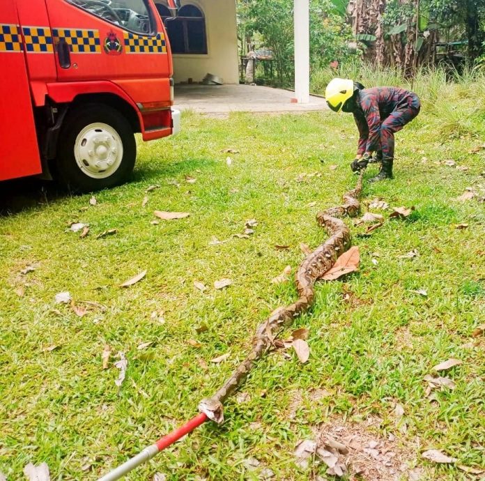 双溪格本消防局今日在接获民众的投报住家鸭舍出现蟒蛇后,派出3名消防员并在代助理局长穆哈末穆兹里阿里率领赶往甘榜布达的民宅协助捕捉蟒蛇。