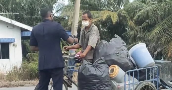 (吉辇13日讯)印裔警长在巡逻期间,突然截停路上拾荒的马来老伯,原来是要捐钱给对方!