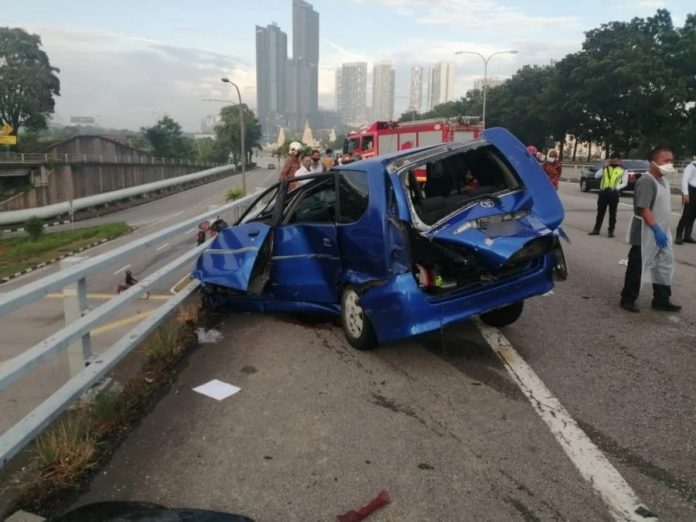 (吉隆坡4日讯) 恐怖车祸!轿车失控冲撞大道左旁护栏,导致2名乘客死亡,其中一名死者在车祸后被抛出车外,身体插入护栏铝制栏杆。