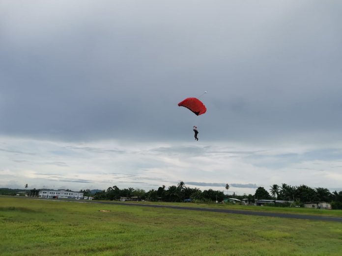 昨早在拿笃机场,进行伞降演习共有 10 名军官分别来自 ESSCOM 及 69 名突击队员。他们从高空1200英尺空中跳伞演练,包括双人跳伞,精准操作降落伞,安全着陆到预定集结地域,展示了特种部队空降作战能力。