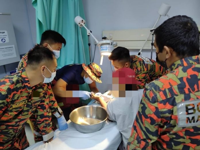 (亚庇30日讯)戒指紧套手指没办法脱下,劳动消拯员到医院帮忙动手术。
