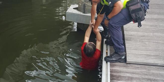 今早11时20分左右,4名隶属古晋中央警署的脚车骑警,在河滨公园如常进行巡逻工作,当来到河滨公寓后方时,其中一名骑警发现浮动码头有一双整齐置放着的拖鞋,但没见到人影,详细查看时,惊见有人在水中,并紧紧的捉住码头边沿没有沉入水里。