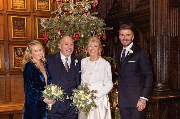 “大卫是伴郎,他做了伴郎所做的所有平常的事情,比如拿著戒指,他也在婚礼上发表演讲。伴娘夏洛特、弗朗西斯卡和哈珀穿著蓝色天鹅绒连衣裙看起来很漂亮。这对夫妇目前正在国外度蜜月。”