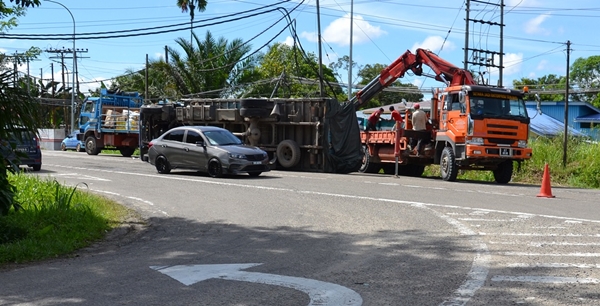 保佛13日讯|一辆载满货物的巨型罗厘,今早在保佛林巴望通道路口处翻覆,车斗内装载的货物也散落一地,造成该处交通阻塞将近一句钟,庆幸上述交通事故,没有造成任何人命伤亡事件。