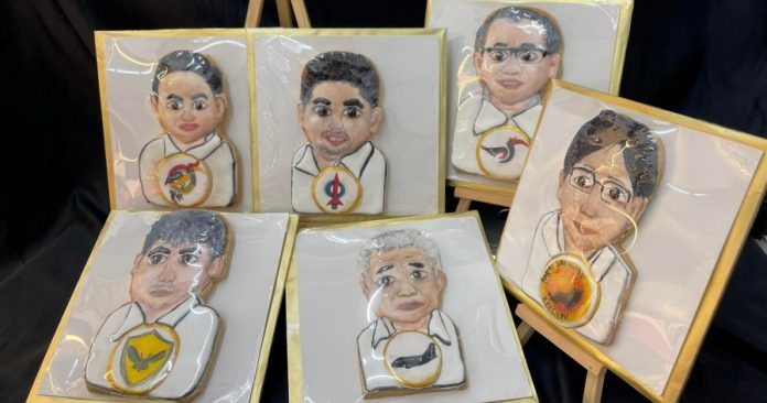 (民都鲁14日讯)第十二届砂拉越选举选情紧张,蛋糕屋负责人刘娃娃亲手制作丹绒峇都区6位候选人的糖霜饼干,表情萌爆,生动有趣。