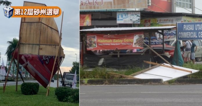 他说,据他了解,被大风吹到的有砂政盟、民主行动党、砂团结党和肯雅兰党候选人的竞选宣传看板和横幅。