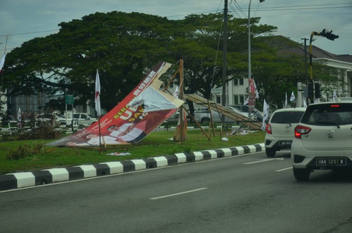 (美里16日讯)昨晚一阵狂风暴雨吹袭,埔奕区多个竞选看板和标语遭刮倒,一片狼藉!