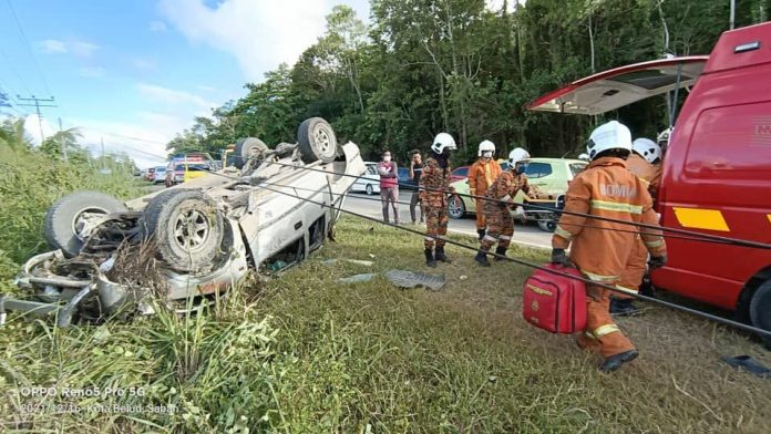 (亚庇15日讯)行驶中一辆四驱车失控翻覆,导致一人夹在车内,由消防员救出送院治疗。