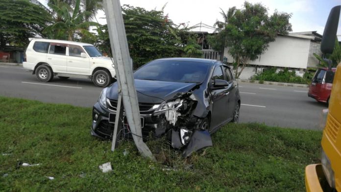 亚庇16日讯|一辆行驶中的国产迈威失控撞向分界堤的灯柱,造成巫裔女司机轻伤。