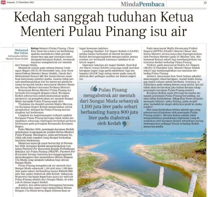 他强调,槟州每日从慕达河提取80%水源(即11亿立方升),反观吉打州每日只提取8亿立方升的水源。