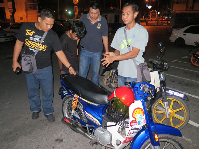 警方称,首名男嫌骑着摩托车前往油站添油时,被警员发现摩托车可疑,于是上前检查,岂料该青年见贼踪暴露,即弃车逃跑,所幸脚程不及警员快,被穷追不舍的警员逮捕。