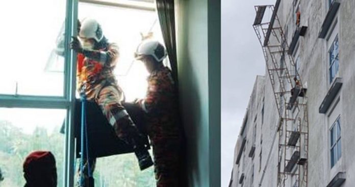 (古晋17日讯)鹰架倾斜摇摇欲坠,油漆工人惊险吊在5楼高处,一度被公众以为是投缳自尽报警求助,消防队来到现场施援将他救回建筑屋内。