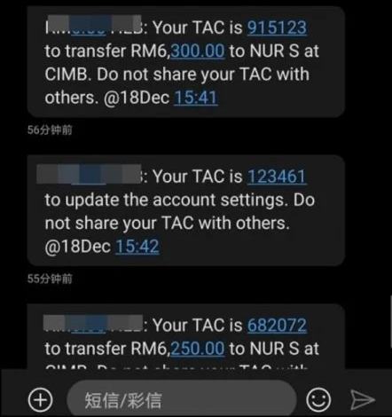 事主为现年25岁的罗姓男子(保险从业员),居住在古来公主花园。据了解,罗姓男子昨日在家时,在下午3时38分至3时47分之间,手机连续收到6个涉及转账的一次性密码。