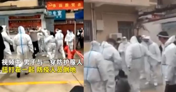 从影片中可以看到,一名男子跟防疫人员发生冲突,双方扭打起来,后来多位防疫人员一起上前制伏对方,男子被扑倒在地遭围殴,旁边一堆人围观,还有拿手机录影,最后有人出面制止才停手。