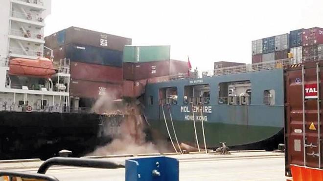 巴生西港公关经理鲁本安峇拉甘在文告说,事发当时,MV Northern Democrat货船准备停泊时,却不小心碰撞到MV MOL Empire货船的尾部,造成船上3个叠起的货柜掉入海里,岸边的一根柱子也被撞损。」