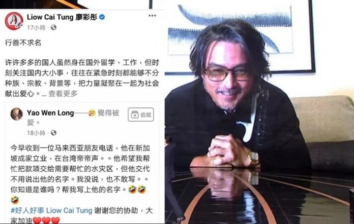 新传媒艺人姚彣隆昨日在面子书专页贴文透露,他收到一位在新加坡成家立业,在台湾“帝帝声”的马来西亚朋友来电,希望他能协助对方,将一笔善款交给需要帮忙的水灾区。