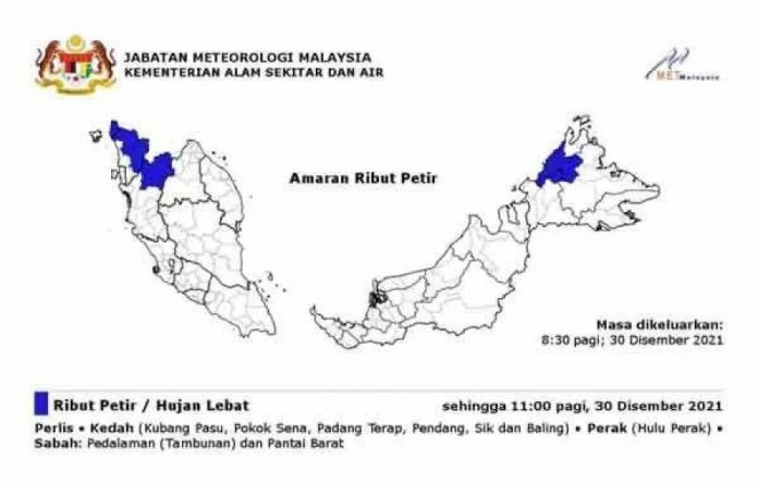 (吉隆坡30日讯)气象局今早向玻璃市、吉打、霹雳和沙巴发布雷雨警报,相关州属部分地区将迎来雷雨至早上11时。