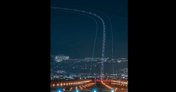 当时NIIYA在大阪国际机场拍摄飞机起飞,用长时间曝光,成功拍出这条梦幻般的“道路”。