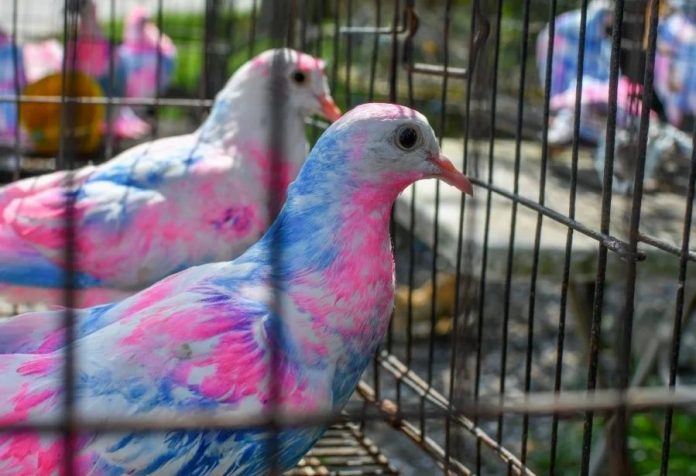 吉兰丹州道北近日有一名商家,为吸引顾客目光,将原本拥有本身天然色泽的鸽子,染成粉红与粉蓝色混搭的“彩虹鸽”。