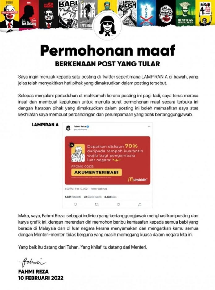 法米昨晚在推特发布道歉文时表示,自己因发布对部长有侮辱性的相关海报贴文而被提控上庭,他对此深感后悔,因此决定写下公开道歉信,希望道歉对象可原谅他不负责任的比喻及比较行为。
