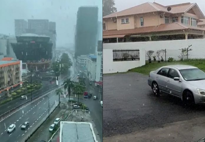 两则分别以亚庇市区的沙巴曙光广场及兵南邦一住宅区作为背景,在雨中有白色如雪花般飘落。
