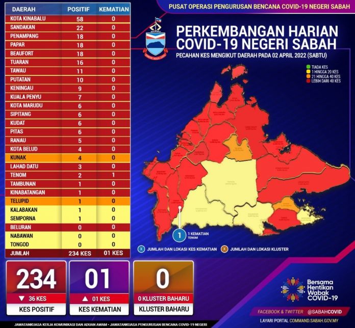 (亚庇2日讯)沙巴新冠疫情呈放缓趋势,今日新增234宗确诊病例,比昨日减少36宗,全州累积确诊病例达36万7913宗。