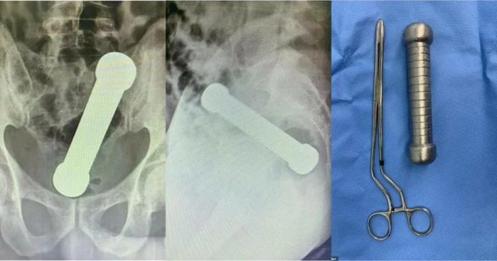 医生透露,男子在体检期间相当不配合,所以猜测他是因为“性行为”造成身体出问题。而X光片显示,有一个长约20公分的哑铃,卡在男子的直肠与结肠交接处,尽管医生想透过手术镊子夹取,但始终无法夹出哑铃,无可奈何之下,医生只好亲自“动手”,把手臂一部分伸入患者的直肠中,才终于顺利取出哑铃。