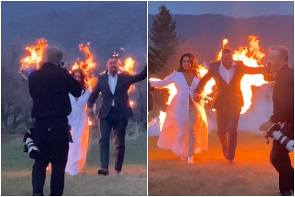 美国发生一场令人难忘的婚礼,新郎新娘准备退场时,十指紧扣、面带微笑地挥手致意,与此同时,2人背后竟在燃烧着熊熊火焰,宾客却兴奋欢呼。