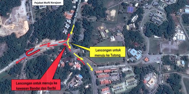 来自皇宫方向沿本基兰阿纳莎莉哈苏丹后路要前往市中心的车辆,在到达这个地点时,须先转入本基兰巴布拉者路然后再U转回来;而来自市中心方向的车辆,则须改用一条新辟的临时车道。