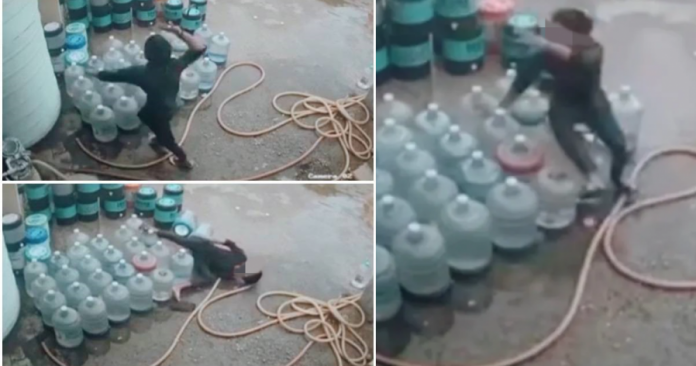综合媒体报导,一名叫帕特尔(Jibran Patel)的抖音用户本月2日在抖音分享一段监视器画面,只见一名男子在一个放满桶装水瓶的地方,他先搓揉脸部后望向周围,接著似乎看到什么东西,开始抓狂似地对著空气出拳乱打,之后脚步踉跄摔倒在桶装水上,呈扭曲诡异的姿势在地上抽搐,下秒一动也不动。