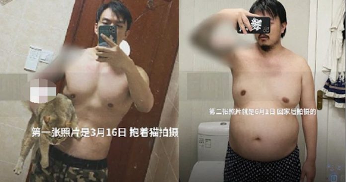 马男近日晒出了自己「封控前后」的变化照片,第1张照片是3月16日抱着猫咪拍的,照片中他看起来身材壮硕,有明显的8块腹肌与手臂肌肉;第2张照片是6月1日回家后拍的,不但手臂上的肌肉全没了,两块胸肌也明显下垂,腹肌也成了一整块肥油大肚腩。